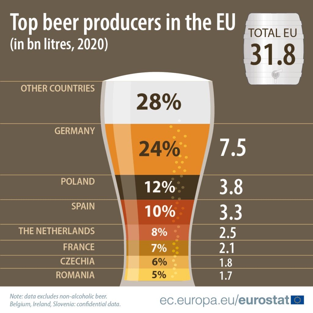 Verilere göre, Almanya, tek başına AB’nin bira üretiminin yüzde 24’ünü üstlendi. Yani Avrupa’daki her dört biradan biri Almanya’dan çıkmış oldu.