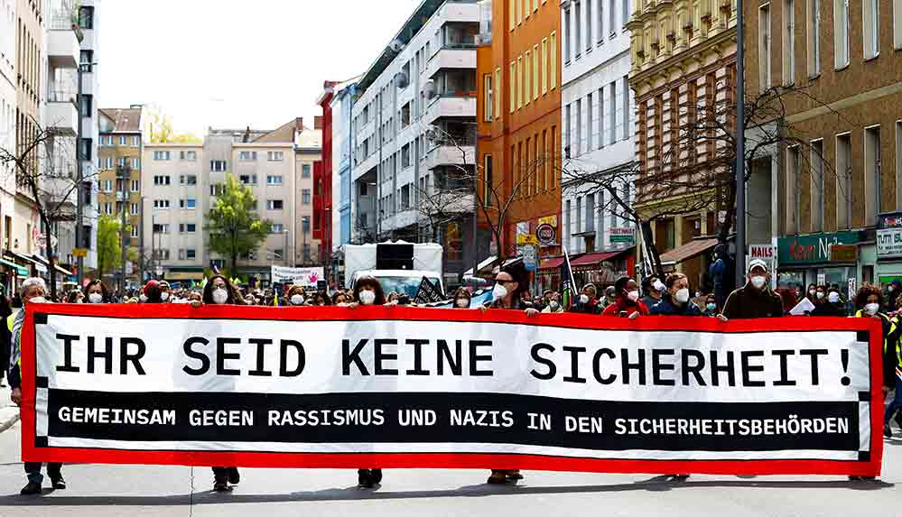 Göstericiler “Siz güvenlik değilsiniz. Birlikte, güvenlik birimlerinde ırkçılığa ve Nazilere karşı”, “Polis şiddetini durdurun”, “Irkçılık bölüyor, AfD’yi durdurun” ve “Polisin acımasızlığını durdurun” yazılı pankartlar ve dövizler taşıdı.