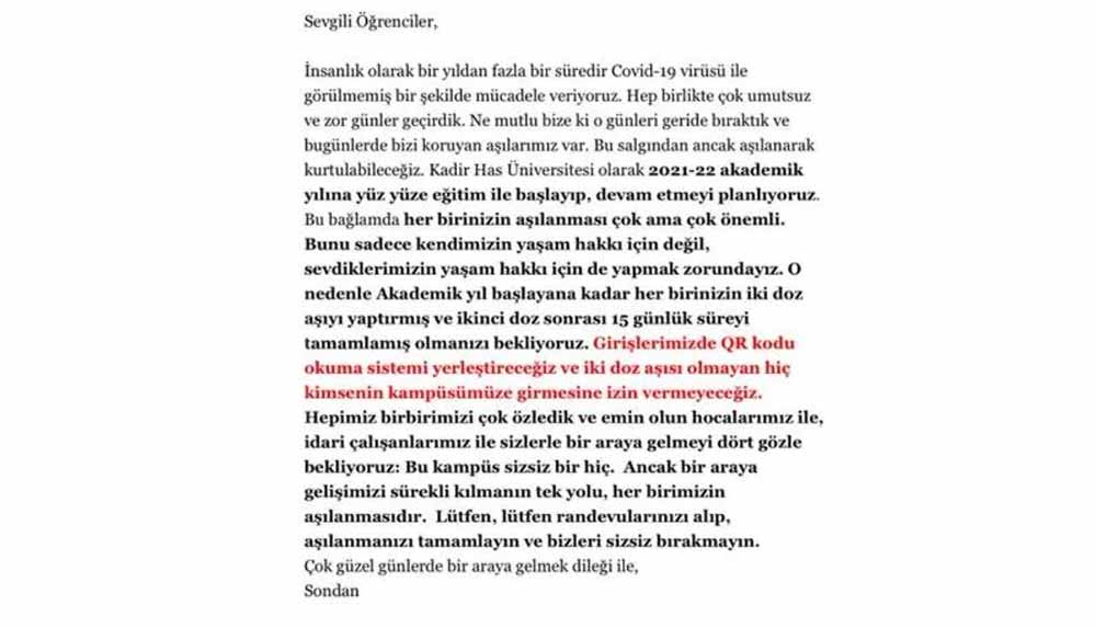 Sosyal medyada gündem olan bir iddiaya göre, Kadir Has Üniversitesi öğrencilerinden aşı olmayanlar, üniversite kampüsüne alınmayacak.