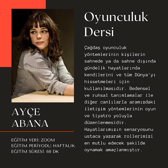 Ünlü oyuncu ve akademisyen, oyuncu eğitmeni Ayçe Abana ‘çağdaş oyunculuk sistemleri üzerine bir yolculuk’ olarak nitelendirdiği eğitimlerini hem yüz yüze hem de online olarak verecek. Ünlü oyuncu eğitimlerini, ” Kendimizle ve tüm evrenle olan ilişkimizi en son farkındalık çalışmalarıyla yeniden keşfetme deneyimi. Hayata yeni bir bakış ve yepyeni bir dokunuş. Sağlıklı bir mutluluğun anahtarı nefes ve ritm ile kendi içsel melodimizi bulma. Hayatın ritmini ve zamanını kendimizin belirleyebileceği bir farkındalık yolculuğuna hazırsanız, buluşalım” diyerek özetliyor.