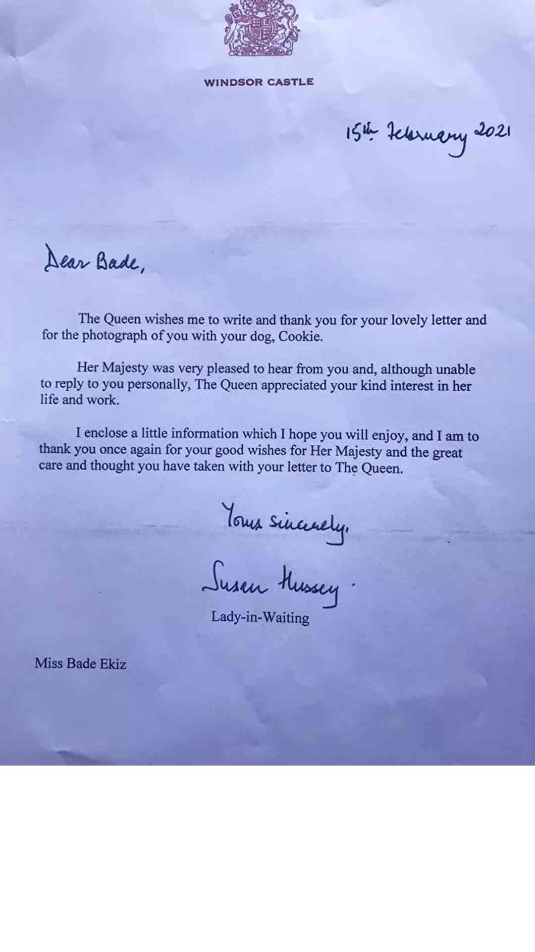 Öğrenci Bade Ekiz’in köpeğiyle fotoğrafını da eklediği mektubun kendilerinde büyük bir memnuniyet oluşturduğunu ve kraliçe hakkında iyi dilekleri için de teşekkürlerini iletti.