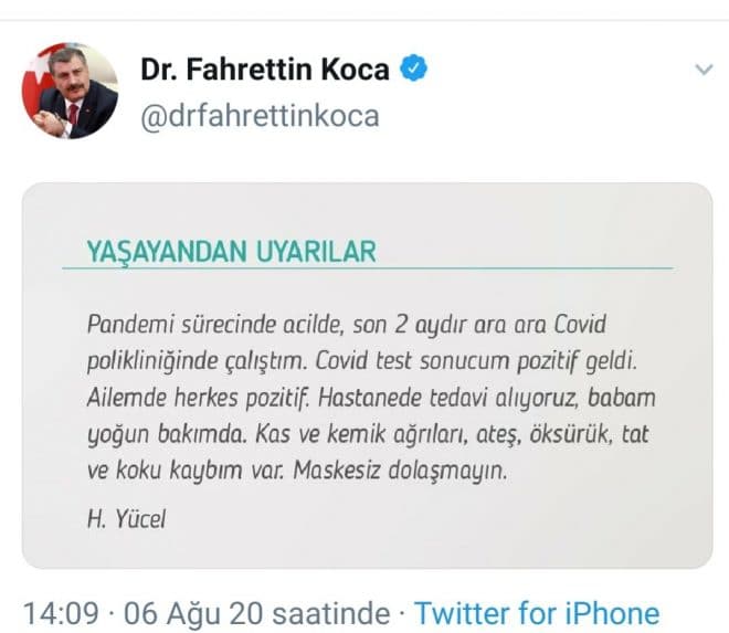 Sağlık Bakanı Fahrettin Koca da Yücel’in bu paylaşımını sosyal medya hesabından “Yaşayandan Uyarılar” başlığı ile paylaştı.