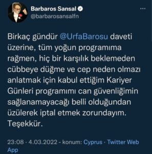 Bu paylaşımları sosyal medya hesabından retweet yapan Barbaros Şansal da “Birkaç gündür Urfa Barosu’nun daveti üzerine, tüm yoğun programıma rağmen hiçbir karşılık beklemeden ‘cübbeye düğme ve cep neden olmaz’ı anlatmak için kabul ettiğim Kariyer Günleri programımı can güvenliğimin sağlanamayacağı belli olduğundan üzülerek iptal etmek zorundayım. Teşekkür” paylaşımı yaptı.