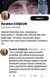 Söz konusu nefret ve tehdit paylaşımlarına, kısa sürede çok sayıda kullanıcıdan tepki geldi. Kullanıcılar, İbrahim Coşkun’un profilindeki, “Yaratılanı yaradandan dolayı sevmek” vurgusuna gönderme yaparak, üslubunu eleştirip, nefret söyleminde bulunduğunu ifade etti.