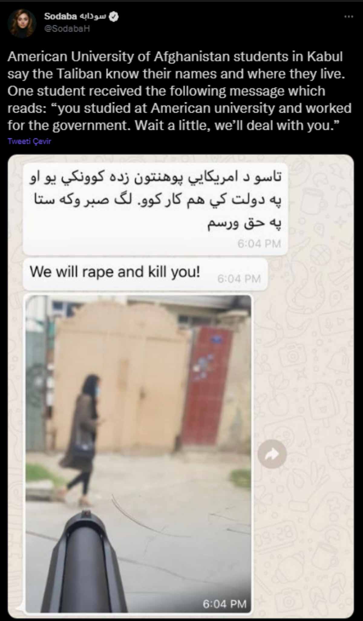 BBC World muhabiri Sodaba Haidare, Taliban'ın Afganistan'daki Amerikan Üniversitesi öğrencilerine yazdığı mesajları sosyal medya hesabından paylaştı.