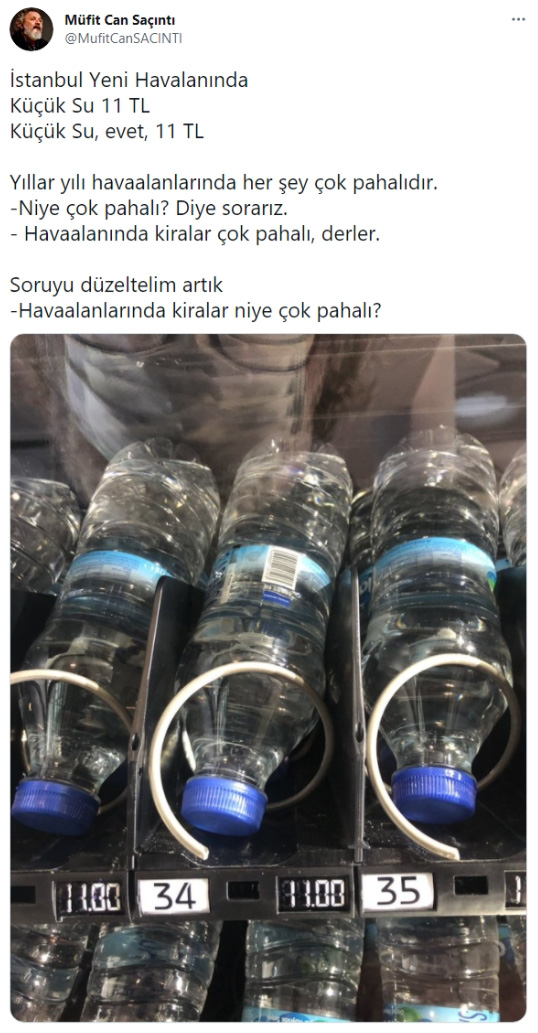 Geçtiğimiz haziran ayında oyuncu Müfit Can Saçıntı da İstanbul Havalimanı’ndaki ‘su’ fiyatından dert yanmıştı. Saçıntı, “Havaalanında kiralar niye çok pahalı?” diye sormuştu.