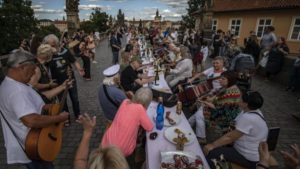 Prag’daki Charles Köprüsü üzerine kurulan 500 metre uzunluğundaki yemek masasının etrafında toplanan binlerce davetli, evlerinden getirdikleri yiyecek ve içecekleri paylaştılar.