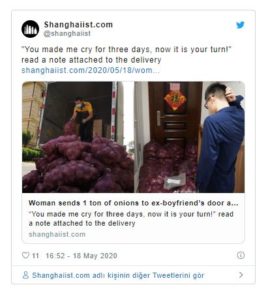 Bunun üzerine harekete geçen Zhao, bir ton soğan sipariş etti ve erkek arkadaşının kapısına teslim etmesi için bir firmayla anlaştı. Firmadan, alıcıyla iletişim kurmamasını ve soğanları olduğu gibi kapıya bırakmasını istedi. Zhao, bir de “Üç gün boyunca ağladım, şimdi sıra sende” notunu iliştirdi.