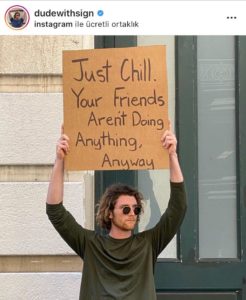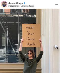 Sosyal medyada 6,5 milyon takipçisi olan dudewithsign hesabı, yıllardır tuhaf veya basit konuları bir kartona yazdığı sloganlarla protesto etmesiyle ünlendi. ‘Seth’ bu kez Corona virüsten korunma yollarını anlatan karton dövizler hazırlayıp takipçileriyle paylaştı.