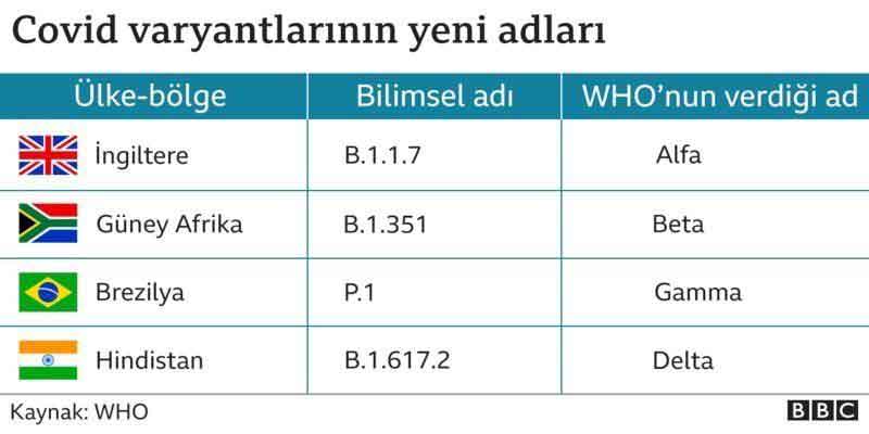 • Delta varyantı – B.1.617.2: İlk kez Hindistan’da görüldü. En az yüzde 40 daha bulaşıcı olduğu tespit edildi. İngiltere’de hakim varyant ve dünya genelinde de hızla yayılıyor.