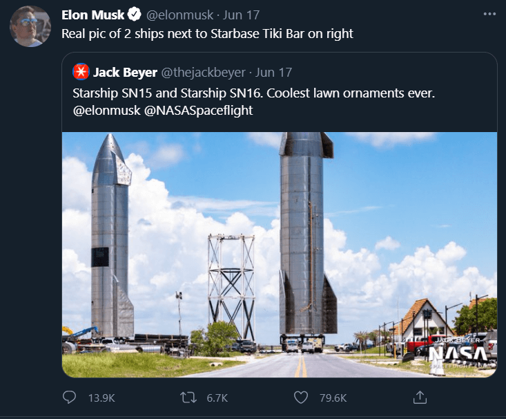 Boca Chica’da, şirketin tüm uzay limanına bakan roket inşa kulelerinden birinde bir restoran ve bar var. Musk, kulenin yüksek bölmesinde bulunan bu bara “Yüksek Bar” diyor. SpaceX, haziran ayında High Bar’da bir partiye ev sahipliği de yaptı.