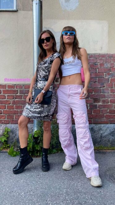 Yazar Tom Moyan tarafından sosyal medyada paylaşılmasıyla ortaya çıkan fotoğrafta Finlandiya Başbakanı’na şeker pembesi bir crop top ve pantolon giymiş fotoğrafçı Janita Autio’nun eşlik ediyor.