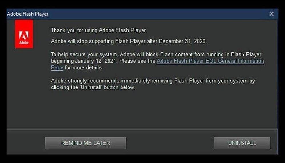 “Adobe Flash Player’i kullandığınız için teşekkür ederiz. 31 Aralık itibarıyla Flash Player’e destek vermeyi kestik. Sisteminizin güvenliğini sağlamaya yardımcı olmak için, Flash Player içeriğini acilen kaldırmanızı tavsiye ediyoruz.”