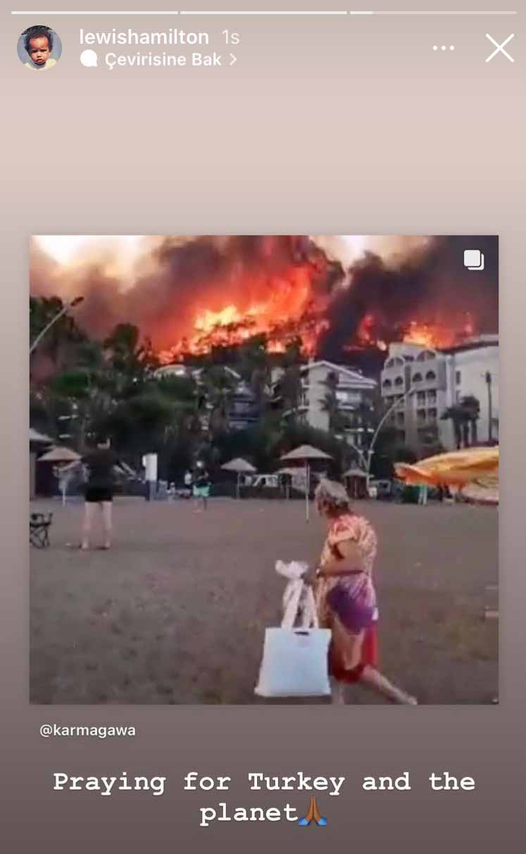 Formula 1’de 7 kez dünya şampiyonu olan Mercedes’in İngiliz pilotu Lewis Hamilton, Türkiye’deki orman yangınları ile ilgili sosyal medya hesabından paylaşımda bulundu.