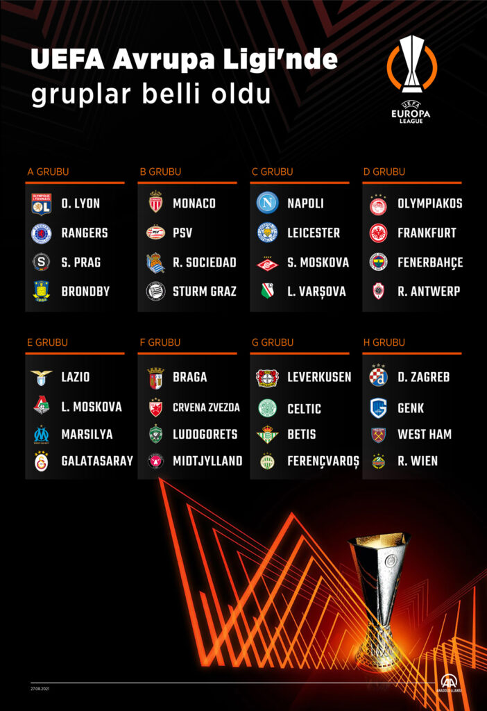 UEFA Genel Sekreter Yardımcısı Giorgio Marchetti ve geçen sezon Avrupa Ligi’nde zafere ulaşan Villarreal’in eski futbolcuları Andres Palop ile Marcos Senna tarafından gerçekleştirilen kura sonucu oluşan gruplar şöyle: