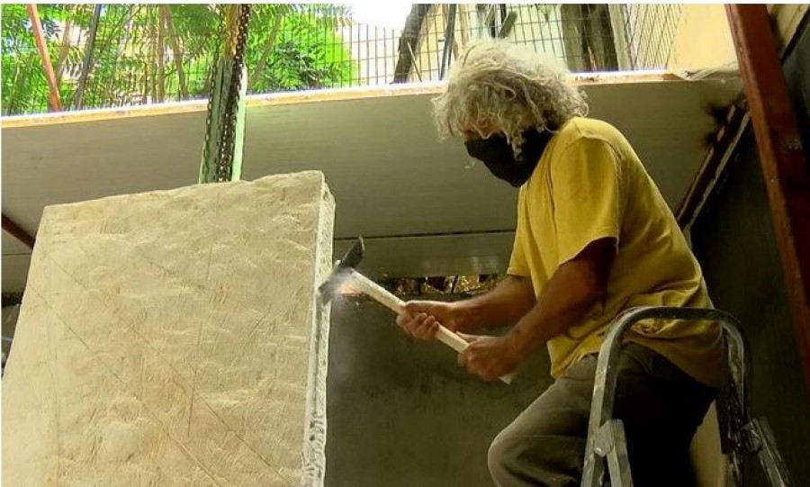 Demirtaş, “Göbeklitepe Şanlıurfa’da olduğu için böyle bir bağlantı kurulsun istendi. Burada bir mermer atölyesinde daha iyi çalışabilmemiz için taş kalibre edildi. Burada kullandığımız taş, masif taş yani kalker taşı. ‘Urfa taşı’ olarak bilinen yumuşak bir taş. Özelliği zaman geçtikçe oksijenle teması sonucunda daha da sertleşiyor olması. Şu anda atölyemizde doku çalışması yapıyoruz daha sonra da üstündeki figürleri çalışmaya başlayacağız” dedi.