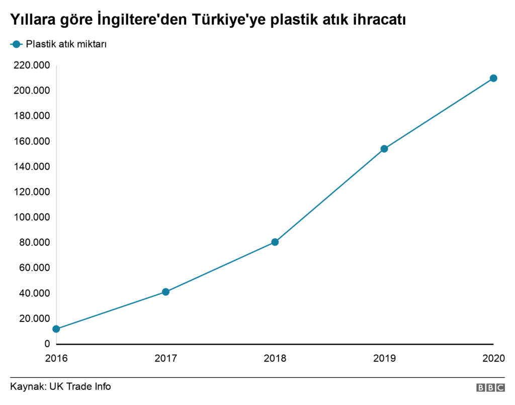 Rapor Türkiye’nin 2016 yılında İngiltere’den 12 bin tonluk plastik atık ithal ettiğini aktarırken, 2020 yılında ise bu miktarın 18 kat artarak, İngiltere’nin toplam plastik atığının yüzde 40’ına denk geldiğini gösterdi.
