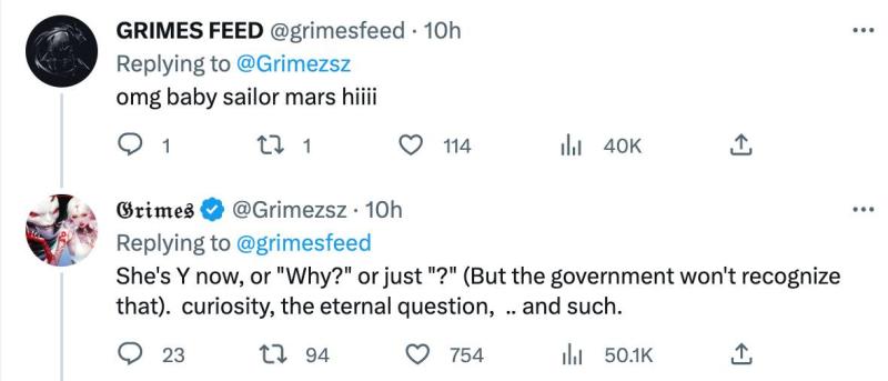 Bunu takiben bir hayran hesabına attığı tweetteyse Grimes, kızının adının değiştirildiğini ve artık sadece Y (İngilizce’de “neden” sorusuyla aynı anlama gelen “why” kelimesiyle Y harfinin okunuşu aynı -ed.n.) olduğunu doğruladı.