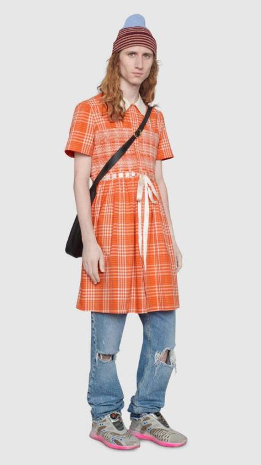 Lüks marka, saten kuşaklı ve tartan desenli turuncu kıyafetin, 1990’ların Grunge akımından ilham aldığını ve cinsiyet kalıplarını parçalamayı hedeflediğini bildirdi.