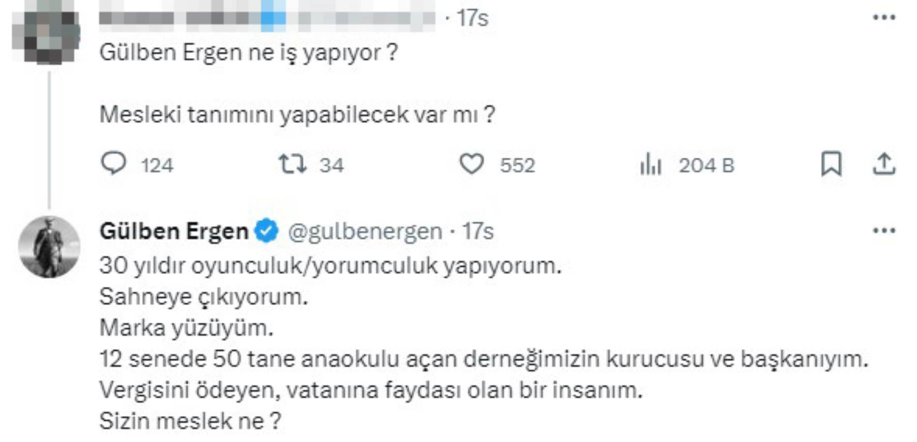 Bir kullanıcının “Gülben Ergen ne iş yapıyor? Mesleki tanımını yapabilecek biri var mı?” sorusunu gören sanatçı, “30 yıldır oyunculuk/yorumculuk yapıyorum. Sahneye çıkıyorum. Marka yüzüyüm. 12 senede 50 tane anaokulu açan derneğimizin kurucusu ve başkanıyım. Vergisini ödeyen, vatanına faydası olan bir insanım. Sizin meslek ne?” yanıtını verdi.