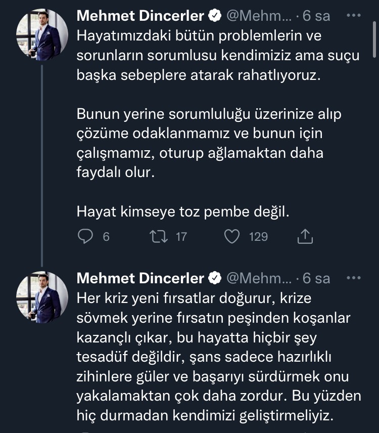 Sözlerini sürdüren Mehmet Dinçerler, “Hayatımızdaki bütün problemlerin ve sorunların sorumlusu kendimiziz ama suçu başka sebeplere atarak rahatlıyoruz. Bunun yerine sorumluluğu üzerinize alıp çözüme odaklanmamız ve bunun için çalışmamız, oturup ağlamaktan daha faydalı olur.