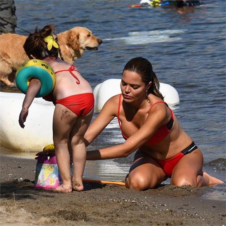 Plajda tanıştığı küçük bir kız çocuğuyla kumda oyunlar oynayan oyuncu, ardından onunla birlikte denize girdi.