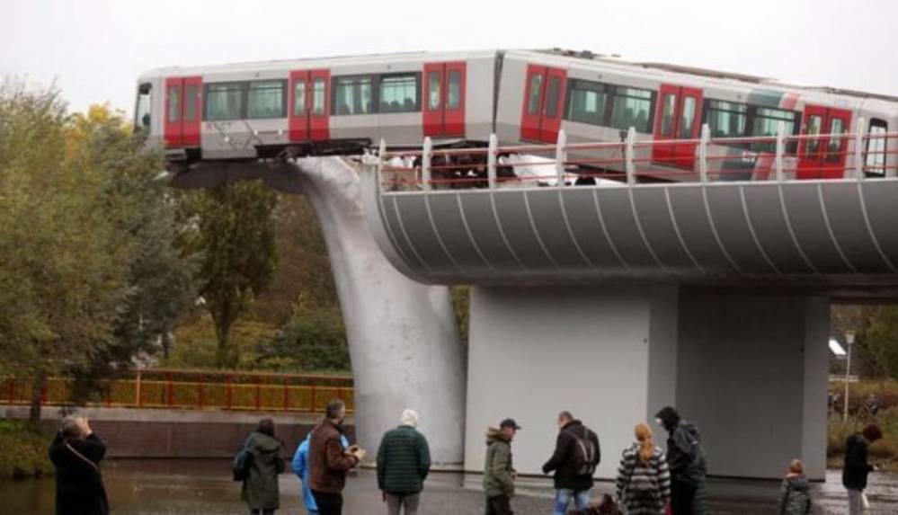 Tren daha sonra 7.5 metre yükseklikte asılı kaldı.