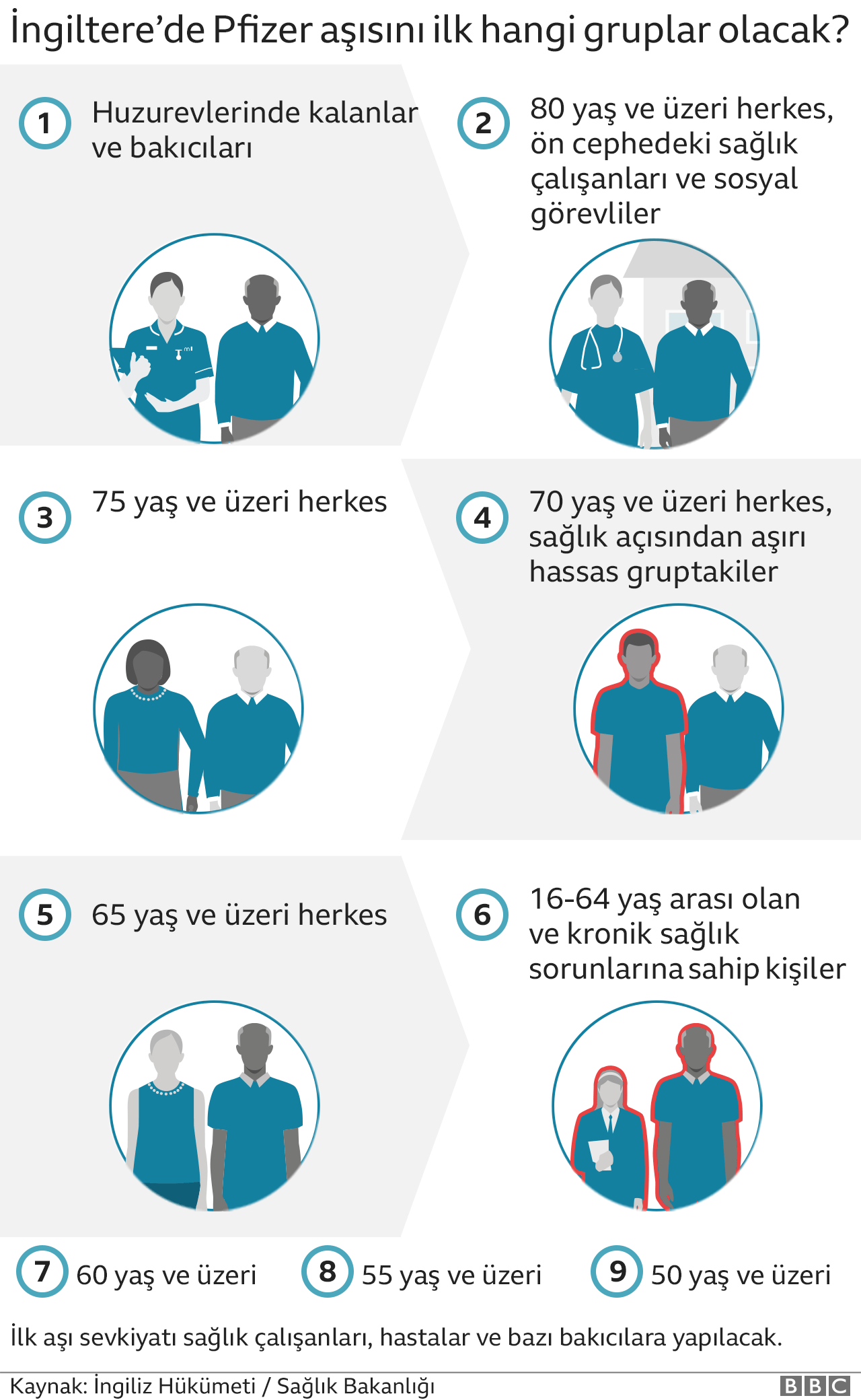 Huzur ve bakım evlerinde kalanlara aşılama iki hafta içinde başlayacak, diğer yüksek riskli gruplara ise önümüzdeki aylarda sıra gelecek. Pfizer ve BioNTech’in birlikte geliştirdiği aşı geçen hafta Birleşik Krallık’taki denetleyici kurumlar tarafından güvenli bulunmuş ve 16 yaş üzerindeki herkese uygulanması için bir aşılama programı başlatılmıştı. Birleşik Krallık bu alanda dünyada bir ilk oldu.