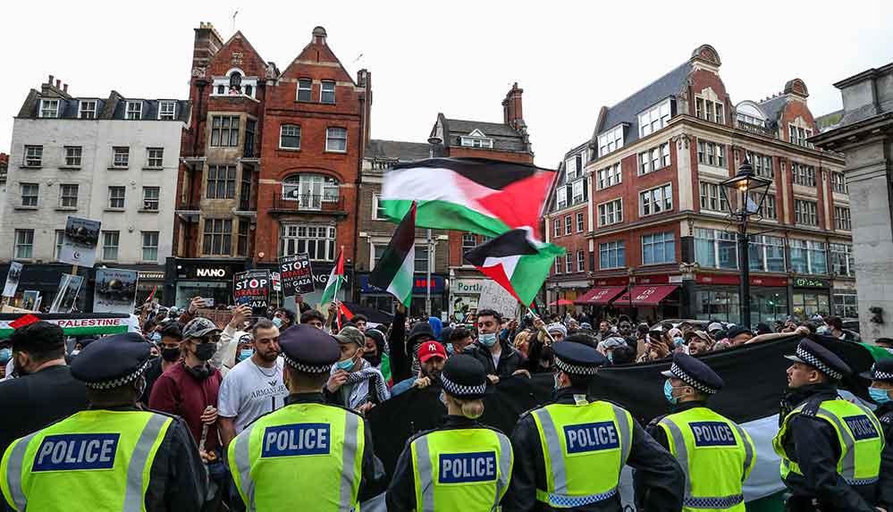 Yaklaşık 5 bin kişi Londra’daki Başbakanlık Ofisi 10 Numara’nın önünde bir araya gelerek, “Özgür Filistin”, “Terörist İsrail” ve “1948’den bu yana nefes alamıyoruz” yazılı pankartlarla İsrail saldırılarının derhal durdurulması çağrısında bulundu.