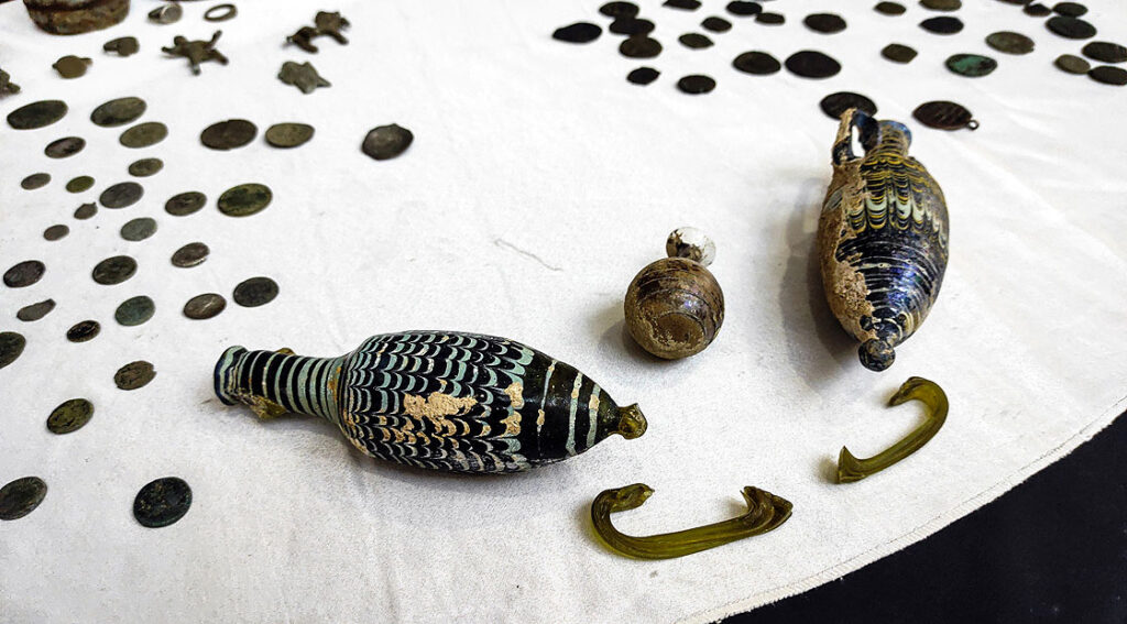 Dönemin sosyo-ekonomik düzeyi ve uğraşları hakkında bilgi veren sikkeler, günlük ve özel amaçlı kullanılan bronz kap kacak, parfüm ve krem şişeleri, ölü kültü hakkında bilgi veren gözyaşı şişeleri, bronz şamdan parçaları, yaka iğneleri ve rozetler gibi süs eşyaları, dini ritüellerde kullanıldığı düşünülen insan biçimli mermer heykelcikler, antik dönemin spor faaliyetleri hakkında bilgi niteliği taşıyan bronz figürler, mızrak uçları, patlamış havan mermisi ve ruhsatsız tabanca ele geçirilenler arasında bulunuyor.