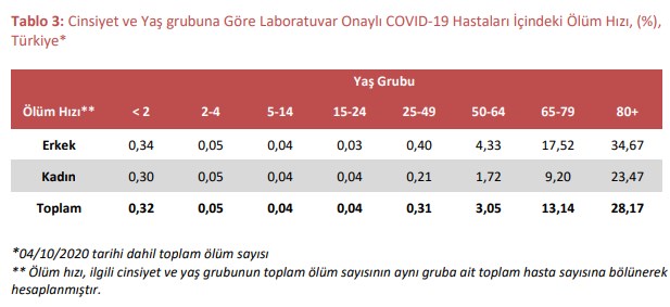 > Türkiye’de toplam 8.441 COVID-19 nedeniyle ölüm bildirilmiş ve Sağlık Bakanlığı tarafından onaylanmıştır. Laboratuvar onaylı COVID-19 hastaları içindeki ölüm hızı %2,59’dur. En düşük ölüm hızı %0,04 ile 5-14 ve 15-24 yaş grubunda gerçekleşirken en yüksek ölüm hızı %28,17 ile 80 yaş ve üzeri gruba aittir.