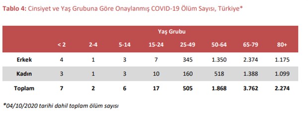 > COVID-19 nedeniyle vefat eden 8.441 kişiden 5.259’u (%62) erkek, 3.182’si (%38) kadındır. Ölümlerin 6.036’sı (%72) 65 yaş ve üzeri kişilerde gerçekleşmesine rağmen hasta sayılarının sadece %11’i bu yaş grubundadır. Şimdiye kadar 15 yaş ve altı çocuklarda COVID-19 nedeniyle 15 ölüm bildirilmiş ve Sağlık Bakanlığı tarafından onaylanmıştır.