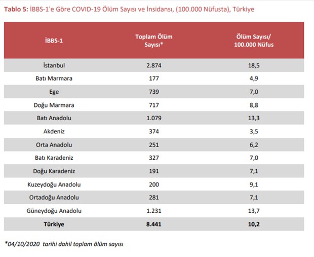 100.000 kişiye düşen toplam ölüm sayısının en düşük olduğu İBBS-1 bölgeleri 3,5 ile Akdeniz, 4,9 ile Batı Marmara ve 6,2 ile Orta Anadolu’dur.