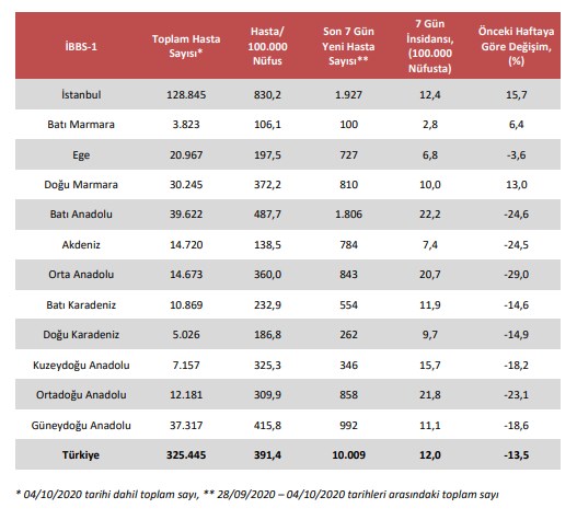 Rapora göre Marmara Bölgesi dışında, Türkiye genelinde yeni hasta sayısı düştü.