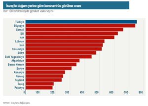 Çalışmada coronavirüse yakalanma ihtimali en yüksek grup Türkiye olduğu sonucuna ulaşıldı. Sekiz haftalık süreçte Türkiye doğumlular arasında 389 vaka tespit edildi. Bu her 100 bin kişide 753 kişinin hastalanması anlamına geliyor. Bu oran İsveç doğumlular arasında her 100 bin kişide 189 kişi.