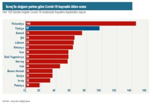 Ajans çalışmada farklı etnik grupları arasındaki ölüm oranlarını da inceledi. Buna göre Covid-19’a yakalandıktan sonra ölüm oranı her 100 bin kişide 145 kişi ile Finlandiya doğumlular arasında görüldü. Bu oran Türkiye doğumlular arasında her 100 bin kişide 97 kişi olurken, Somali doğumlularda 74, Şili doğumlularda 64 ve Lübnan doğumlularda 63 oldu. Bu oran İsveç doğumlularda ise her 100 bin kişide 32 kişi seviyesinde.