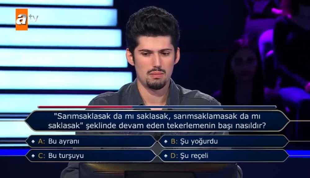 Doğru cevabı ‘Şu yoğurdu’ olması gereken soruya, ‘Bu turşuyu’ cevabını veren Aydoğan, yarışmadan elendi.