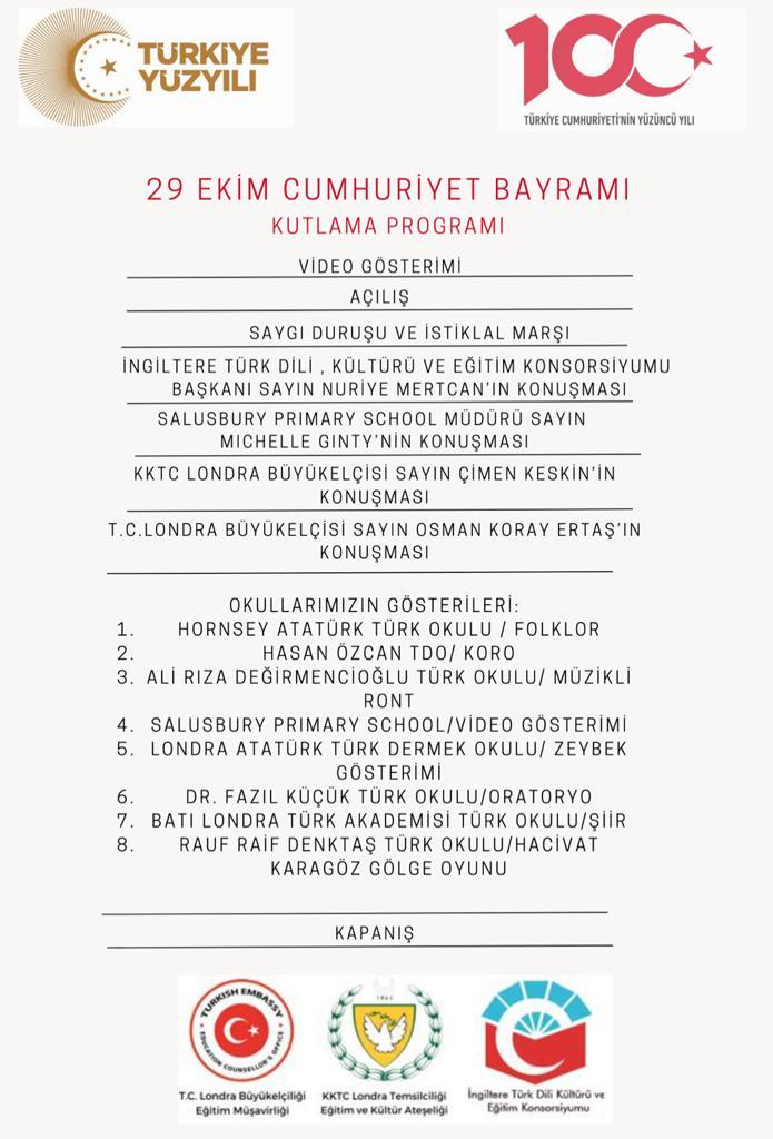 Londra’da Cumhuriyetimizin 100 yıl kutlamaları devam ediyor. Londra Büyükelçiliği Eğitim Müşavirliği’nin İngiltere’deki Türk okullarının katılımıyla gerçekleştireceği etkinlik 5 Kasım Pazar günü (yarın) yapılacak.