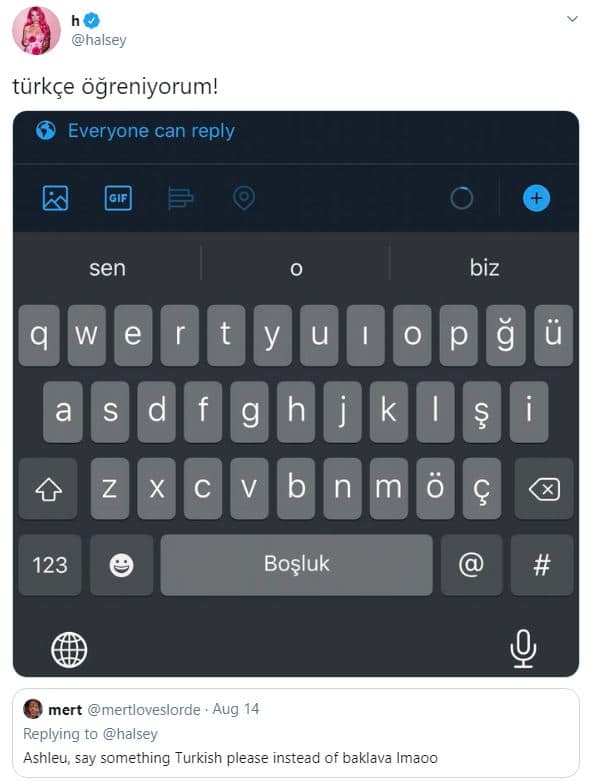 Halsey’nin Türk hayranlarından biri sosyal medyadan yaptığı paylaşımda, “Halsey, baklava dışında bize Türkçe bir şeyler söyle” dedi. Halsey hayranına verdiği yanıtta, Türkçe öğrendiğini duyurdu. Ünlü şarkıcı yaptığı paylaşımda, “Türkçe öğreniyorum!” diyerek telefonunun Türkçe klavyesini de paylaştı.