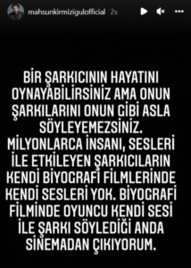 Kırmızıgül, “Bir şarkıcının hayatını oynayabilirsiniz ama onun şarkıcılarını onun gibi asla söylemezsiniz. Milyonlarca insanı, sesleri ile etkileyen şarkıcıların kendi biyaografi filmlerinde kendi sesleri yok. Biyografi filminde oyuncu kendi sesi ile şarkı söylediği anda sinemadan çıkıyorum.” dedi.
