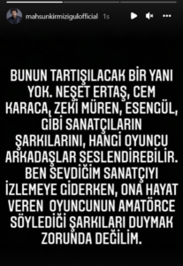 Kırmızıgül ayrıca, “Bunun tartışılacak bir yanı yok. Neşet Ertaş, Zeki Müren, Esengül gibi sanatçıların şarkılarını, hangi oyuncu arkadaşlar seslendirebilir. Ben sevdiğim sanatçıyı izlemeye giderken, ona hayat veren oyuncunun amatörce söylediği şarkıları duymak zorunda değilim.” diyerek yeni bir tartışma yarattı.