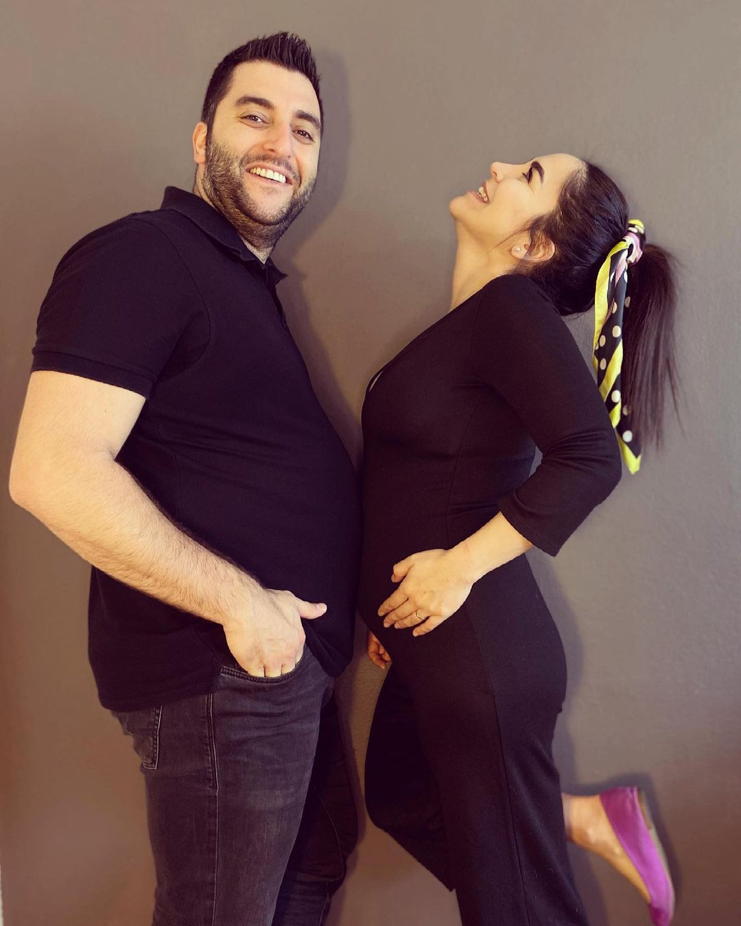 Acarsoy, eşi Uğur Atun ile paylaştığı pozuna ise, “Göbekler yarışıyor adlı fotoğrafımız” notunu düştü.