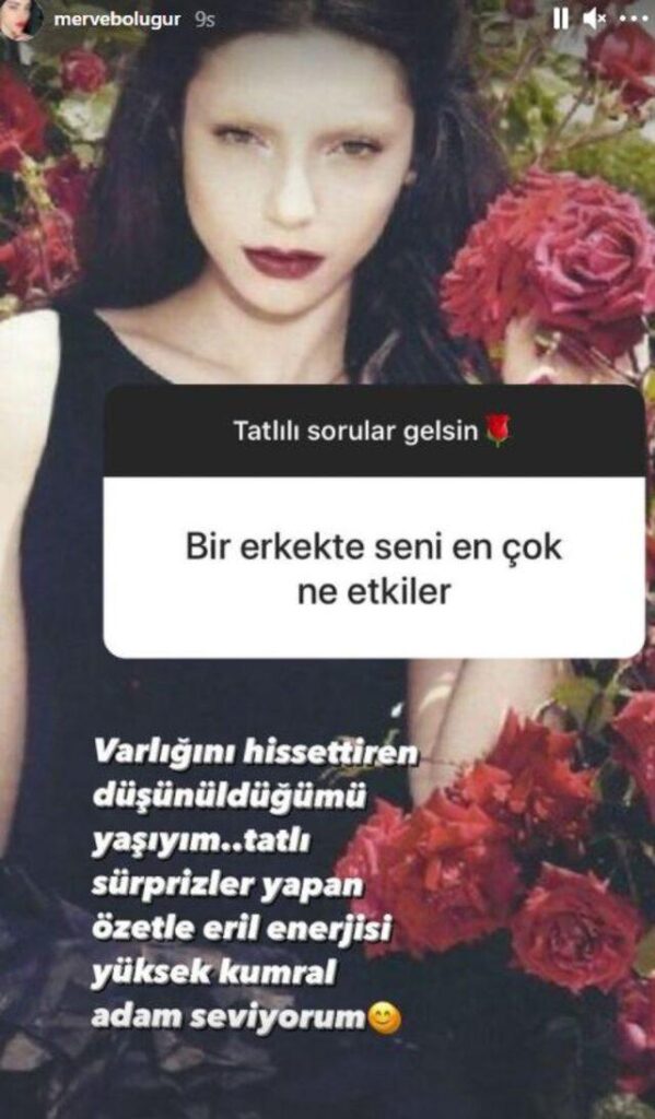 Yeni projeler üzerine çalıştığı açıklayan ünlü oyuncu kendisine gelen “Bir erkekte seni en çok ne etkiler?” sorusuna da yanıt verdi. Merve Boluğur bu soruya şu yanıtı verdi: “Varlığını hissettiren düşünüldüğümü yaşıyım. Tatlı sürprizler yapan özetle eril, enerjisi yüksek kumral adam seviyorum.”