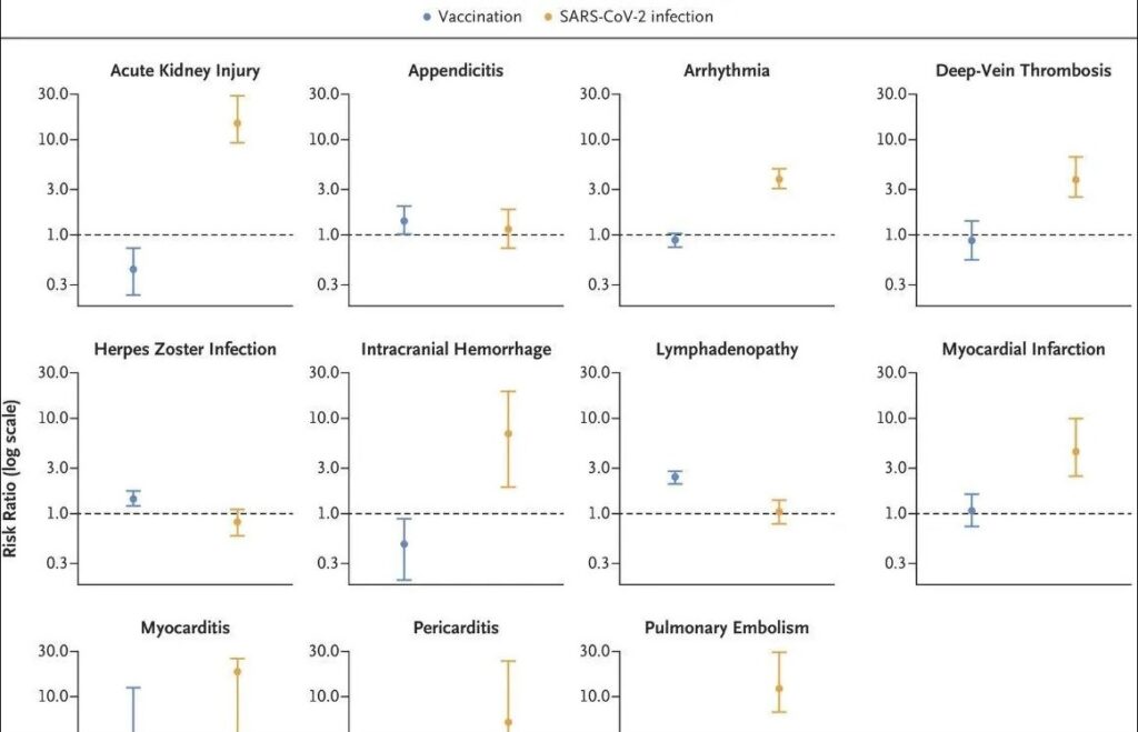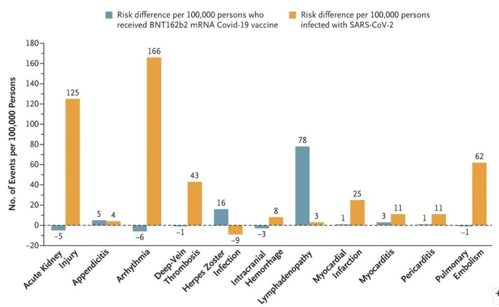 • Ayrıca çalışmada hem hastalığın hem aşının karşılaştırıldığı 100 bin kişide risklerin yer aldığı tabloyu paylaşan Yılancıoğlu, “Sarı olanlar hastalığın kendi riskleri, maviler ise aşının riskleri (Covid-19 100 bin kişide 125 böbrek hastalığına sebep olurken, -5 değeri aşı mesela). Siz hangisini tercih ederdiniz?