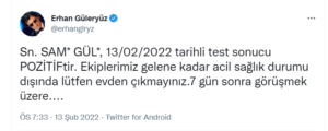 Güleryüz Twitter hesabından yaptığı paylaşımda, Sağlık Bakanlığı’nın test sonucuyla ilgili kendisine gönderilen mesajı aktardı: