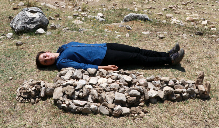 Son günlerde yaşanan kadın cinayetlerine duyarsız kalmayan Büşra Öğüt, Akdağ Yaylası’ndaki arazide, küçük taşlarla kadın vücudunu betimleyen bir heykel yaptı.