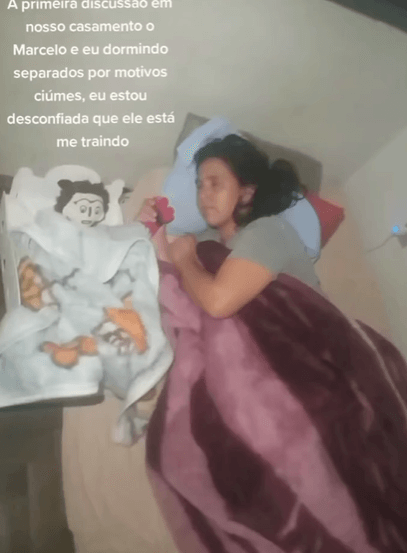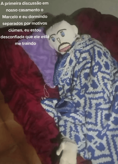 Marcelo adını verdiği bez bebek kocasıyla evliliğinin birinci yılını kutlamaya hazırlanırken Moraes, Marcelo’nun başka bir kadınla birlikte olmak için bir motele gizlice girerken görüldüğünü iddia ediyor.
