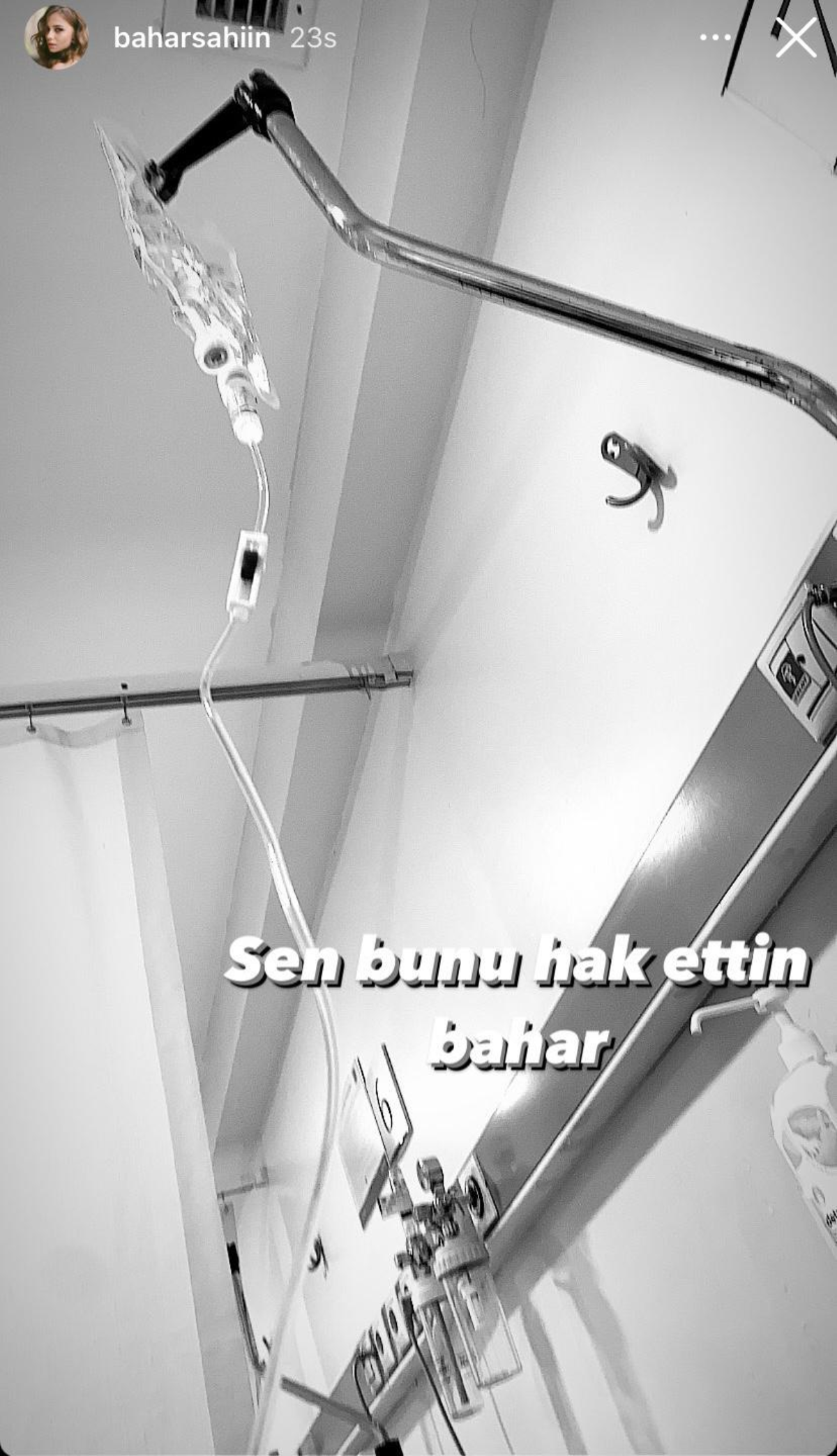 Oyuncu dün öğle saatlerinde Instagram hesabından hastanede serum alırken çektiği bir fotoğrafı paylaştı. Şahin paylaşımının altına “Sen bunu hak ettin Bahar” notunu düştü.