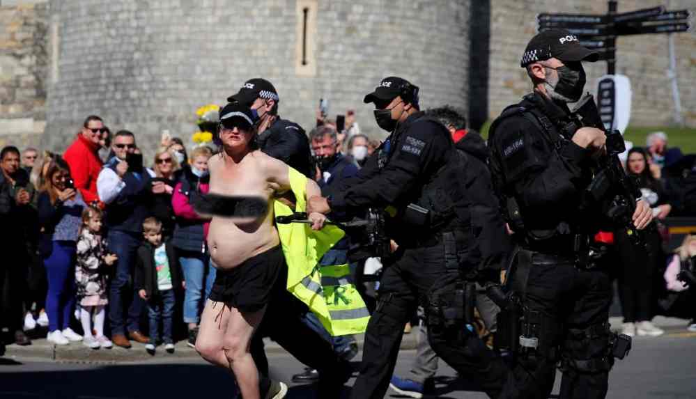 Windsor Kalesi’nin önünde bir dakikalık saygısı duruşu bittiği sırada soyunan bir kadın, kalenin önünde toplanan kalabalığın önüne geçti. Burada Kraliçe’ Victoria’nın heykelinin üzerine zıplamaya çalışan kadın ”Gezegeni kurtarın” diye bağırdı.