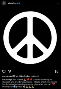 Shayk, “Savaşa hayır” sözleriyle başladığı paylaşımında, UNICEF ve Ukrayna Kızılhaç’ına bağışta bulunduğunu belirtti. Ünlü model, takipçilerinden de ellerinden geldiğinde bağış yapmalarını istedi.